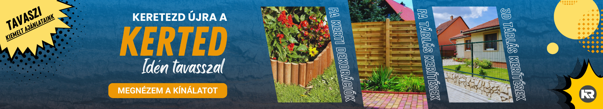 táblás fakerítéseket, félmagas leválasztó kerítéseket, műanyag kerítéseket, gabion termékeket, kerti